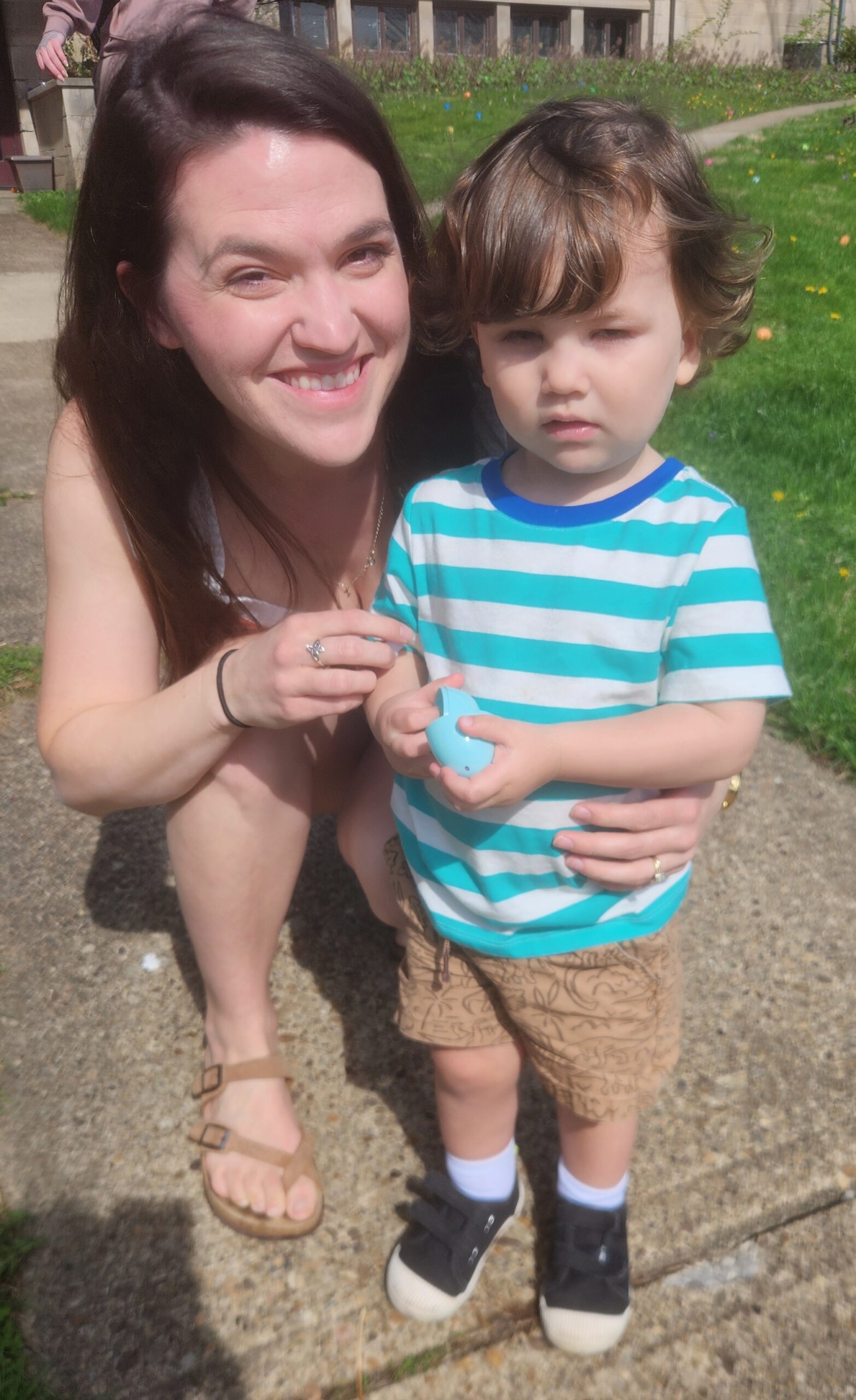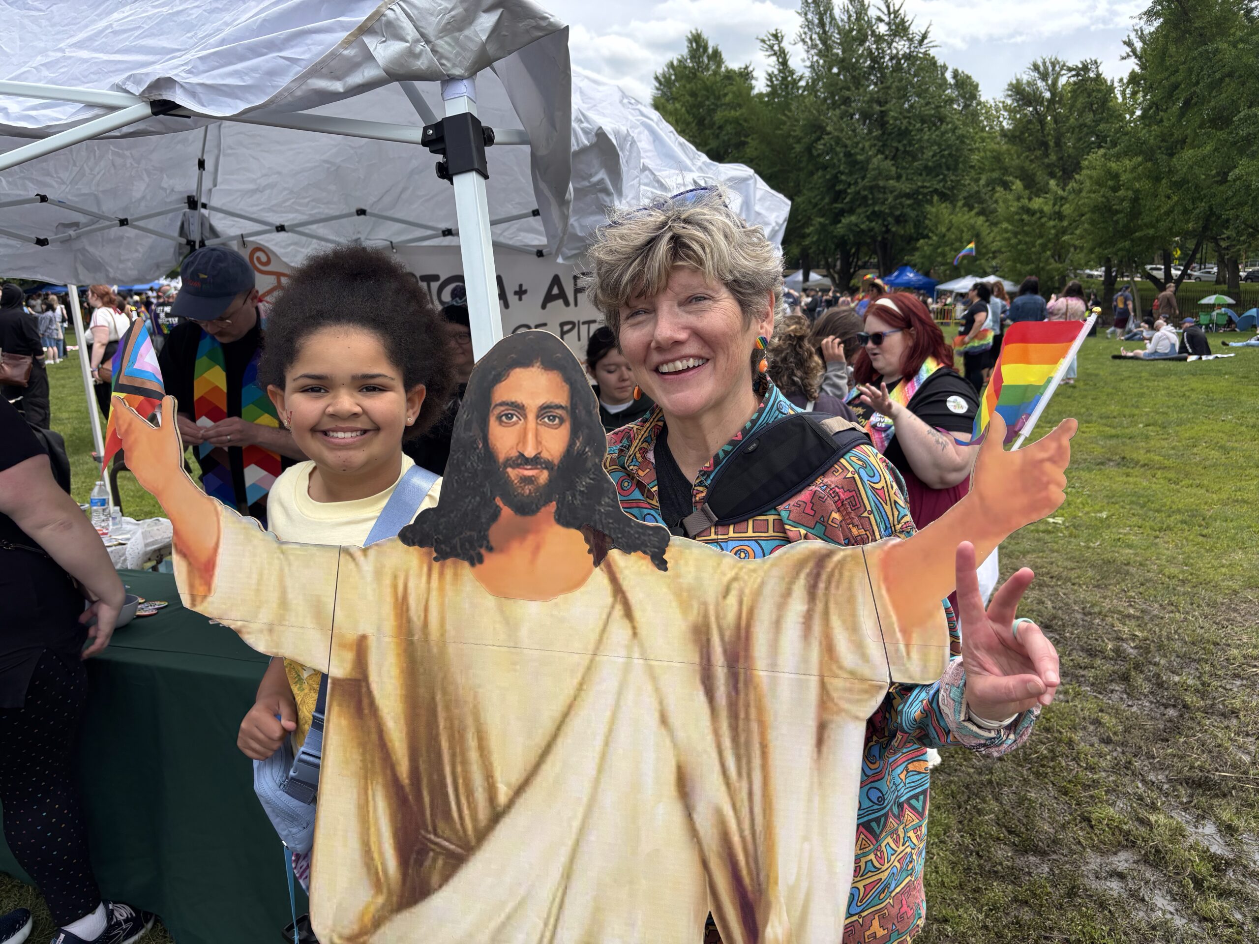Two people smiling at outside event