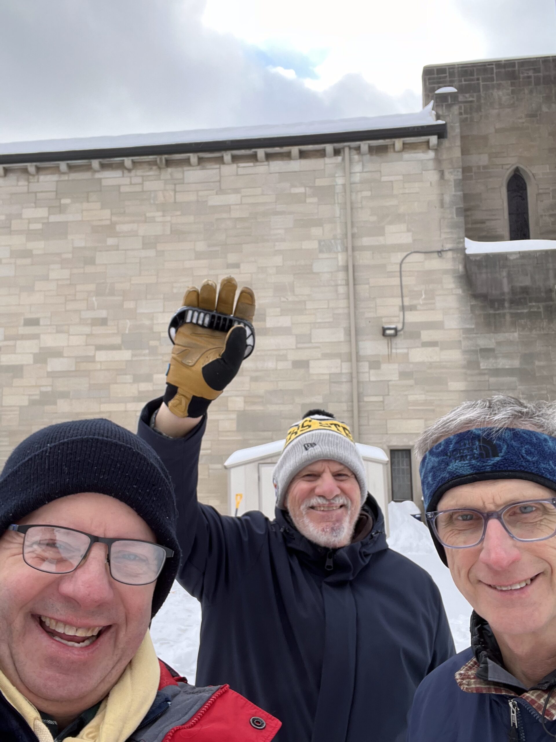 Three men smiling. One waving.